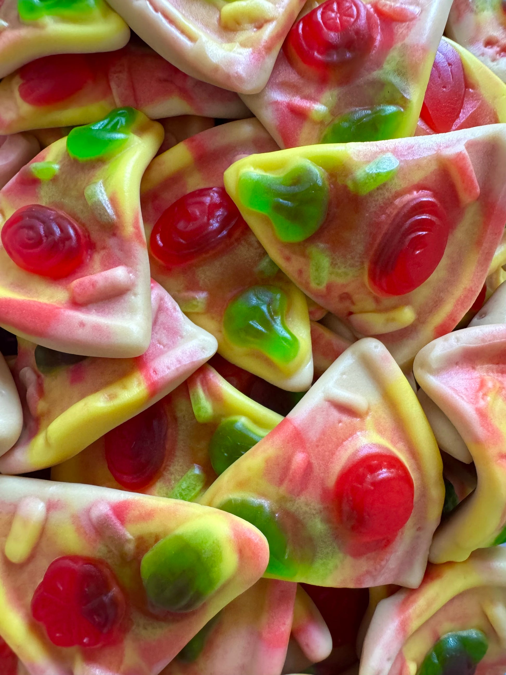Une pizza en bonbon gélifié, moelleuse et généreuse, aux saveurs gourmandes et ludiques.